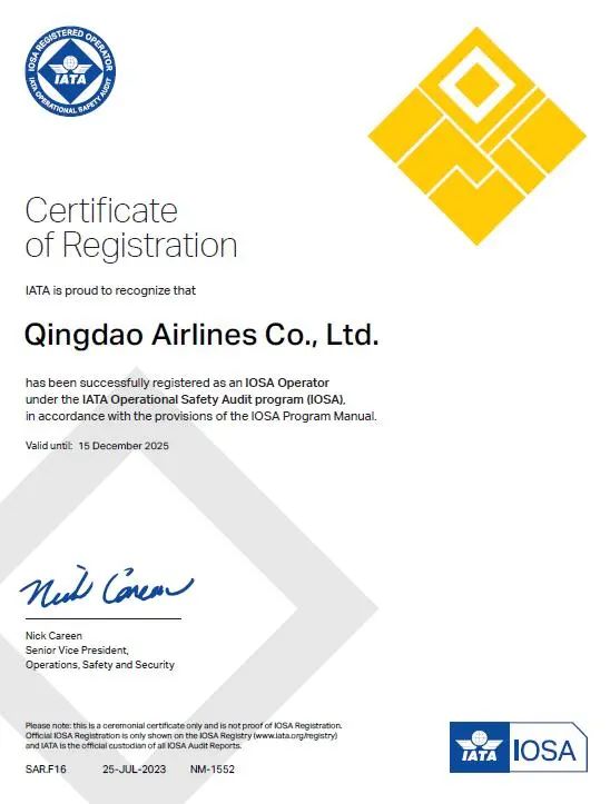 近日,青岛城投集团旗下青岛航空正式获颁国际航空运输协会运行安全审计认证(IOSA)注册证书。这标志着青岛航空完全符合国际航协运行安全标准,成为中国大陆地区第三十七家IOSA注册航司。