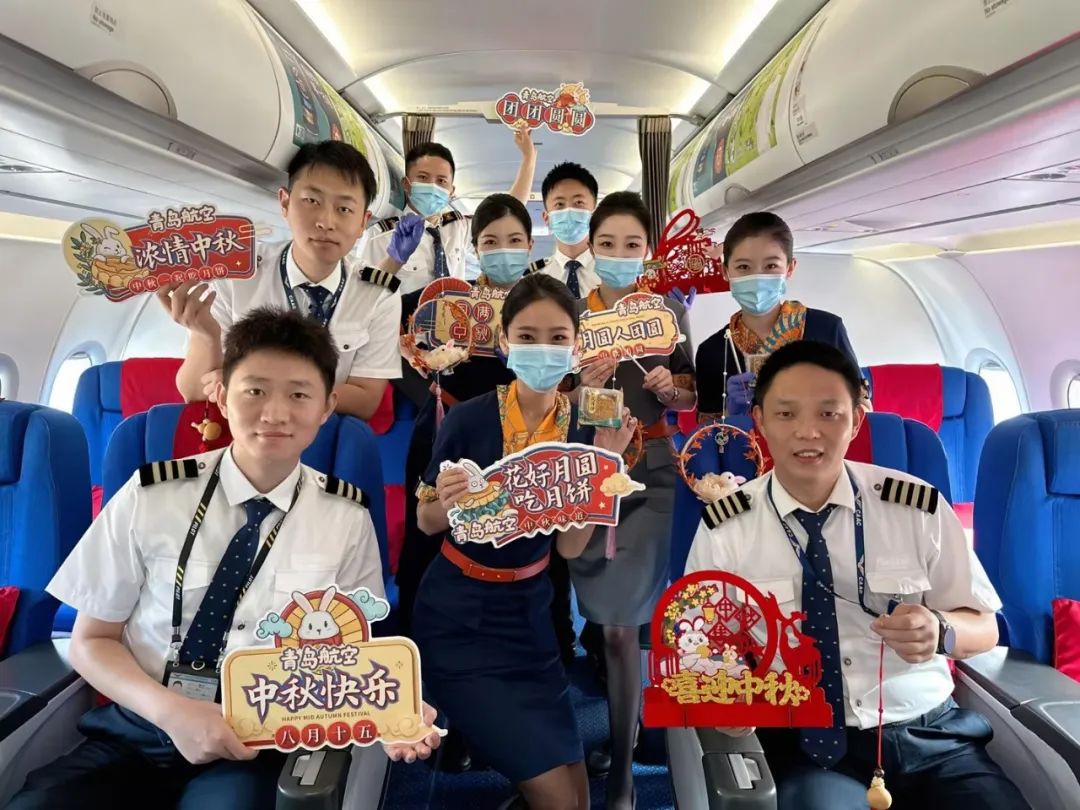 与此同时,中秋及国庆节当天,青岛航空耐冬花示范组分别开展了中秋、国庆主题客舱活动,在万米高空通过与广大乘机旅客积极互动,共庆家国美好时刻,共享双节喜庆氛围。