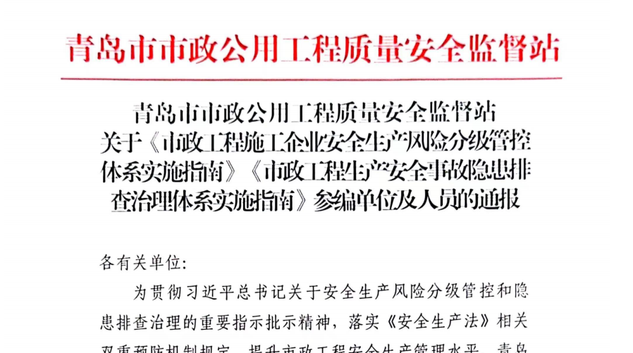 “标准决定质量,有什么样的标准就有什么样的质量,只有高标准才有高质量。”青岛城投集团深入学习贯彻习近平总书记关于安全生产、标准化工作的重要论述精神,近日,城投集团与青岛市市政工程质量安全监督站共同主编两项省级行业团体标准《市政工程安全事故隐患排查治理体系实施指南》(以下简称《隐患排查指南》)《市政工程施工企业安全生产风险分级管控体系实施指南》(以下简称《风险管控指南》),已正式发布实施。(图为两