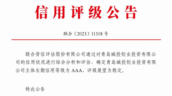 近日,青岛城投集团旗下青岛城投创业投资有限公司(简称创投公司)获得联合资信评估公司评定信用等级,授予主体长期AAA的国内最高信用等级,在集团内成为继集团本部、城金集团、城乡担保公司之后第4家获得境内AAA评级的企业,也是青岛首家、山东省第二家AAA评级创投机构。(图为信用评级公告)近年来,城投集团坚持匹配城市发展战略,不断提高国有资本市场化运作水平,广泛参与青岛市重要基础设施、重点民生项目建设以及战略性新