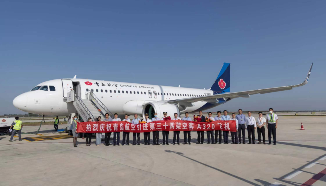 5月19日16时11分,一架全新耐冬花涂装的空客A320Neo飞机顺利抵达青岛胶东国际机场,青岛城投旗下青岛航空机队规模扩增至34架。(图为接机仪式合影)该架飞机客舱共设置180个座位,全经济舱布局,飞机注册号为B-328F,是青岛航空第20架A320Neo机型飞机。该机型主打降低燃油消耗和二氧化碳排放、噪音水平和单座燃油消耗,座舱布局宽敞,乘坐舒适。青岛胶东机场海关通关科组织优秀专家团队对接相关业务,在航空器申报、租金缴纳等环
