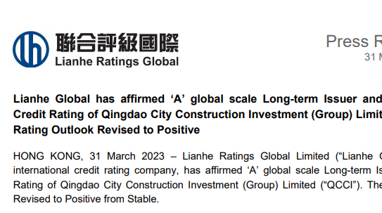 青岛城投再获联合国际“A”境外主体评级,展望调整至正面